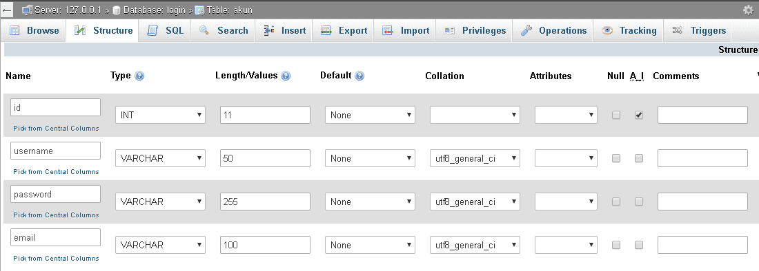 Kemudian buat tabel baru, kita namakan tabel akun.